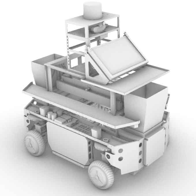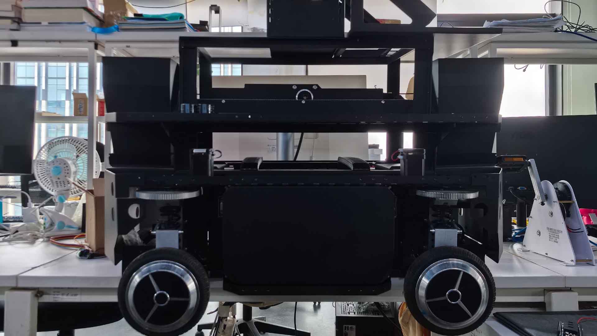 Developed during a period of frequent chassis failures, this testbed provided a stable platform for both algorithm validation and sensor experiments. Its independent steering and suspension support Ackermann steering, zero-radius turning, and crab-walking, while the modular top layer allows mounting different sensors for rapid prototyping. Slightly smaller than the full-scale vehicle, it can operate indoors, enabling convenient office-based testing.